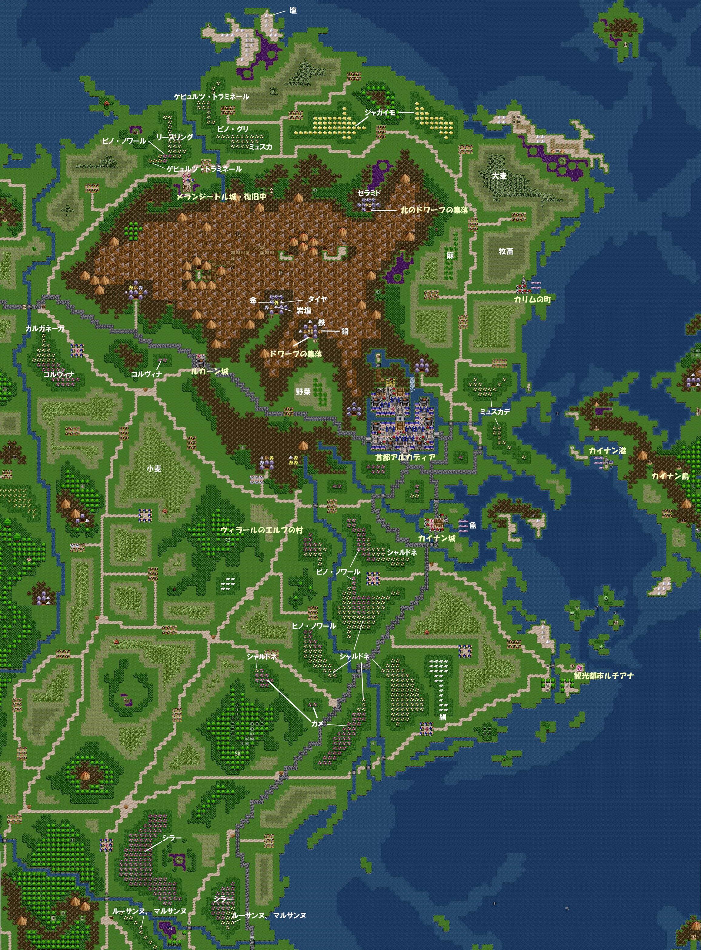こちらは実際にゲームでみることは、ないのですが、世界観を知っていただくために、各地でどのような農作物などが収穫できるかを示したマップです。画像サイズが大きいので縮小しています。画像クリックで実寸サイズになります。