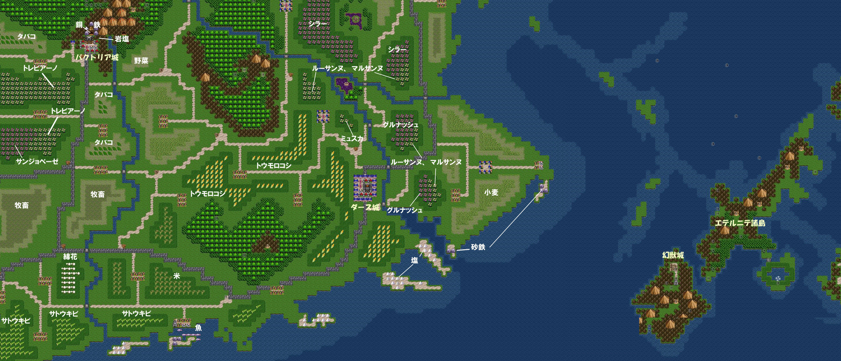 こちらは実際にゲームでみることは、ないのですが、世界観を知っていただくために、各地でどのような農作物などが収穫できるかを示したマップです。画像サイズが大きいので縮小しています。画像クリックで実寸サイズになります。